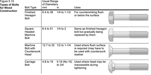 Several types of bolts as shown in Figure 5.10 below, are used for wood construction with the hexagon head type being the most common. Countersunk heads are used where a flush surface is desired. Carriage bolts can be tightened by turning the nut without holding the bolt since the shoulders under the head grip the wood.
