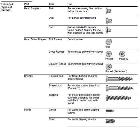 The types of wood screws commonly used are shown in Figure 5.4, below.